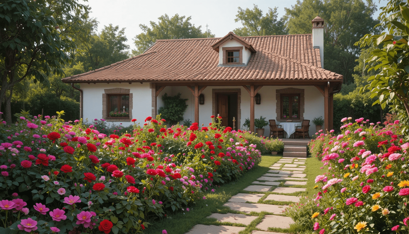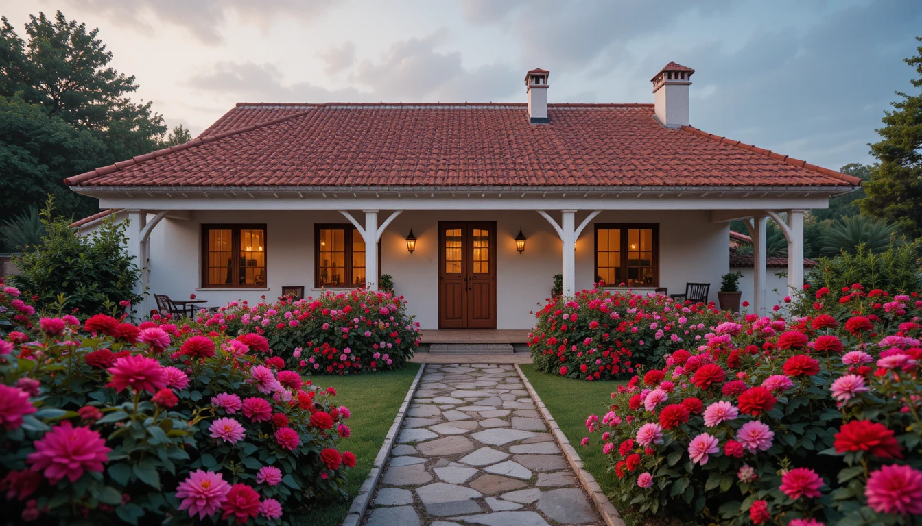 11.-Casa de campo acogedora con techo de tejas color vino, fachada clara, jardín vibrante con rosas rojas, geranios fucsias y dalias anaranjadas, iluminación cálida.