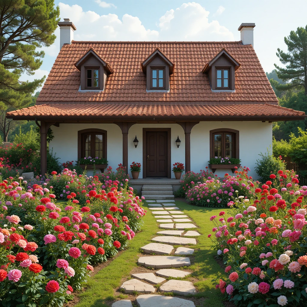 1.- Casa de campo rústica y acogedora con techo de tejas rojas, fachada blanca, jardín abundante con rosas rojas y rosadas, geranios en macetas y dalias de colores, sendero de piedra, luz natural suave, estilo realista.