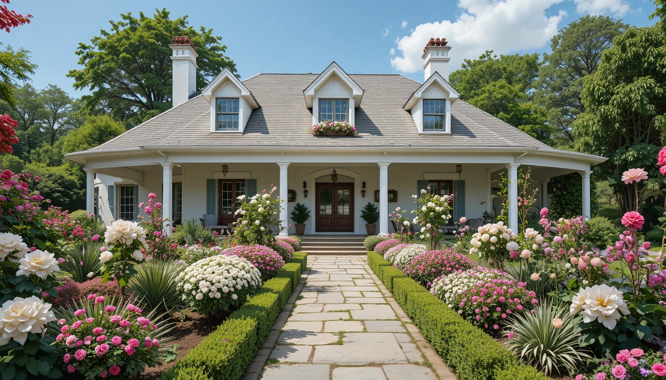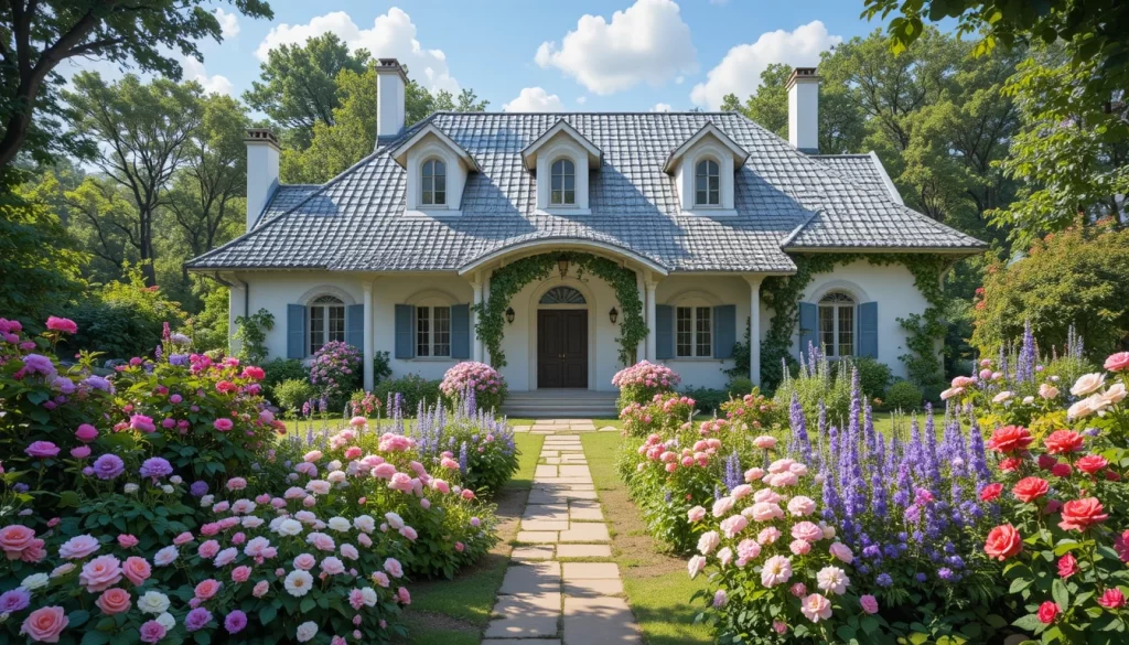 10.-Casa de campo elegante con techo de tejas gris claro, jardín bien diseñado con rosas blancas, geranios rosados y dalias lilas, senderos de grava y plantas bien ordenadas.