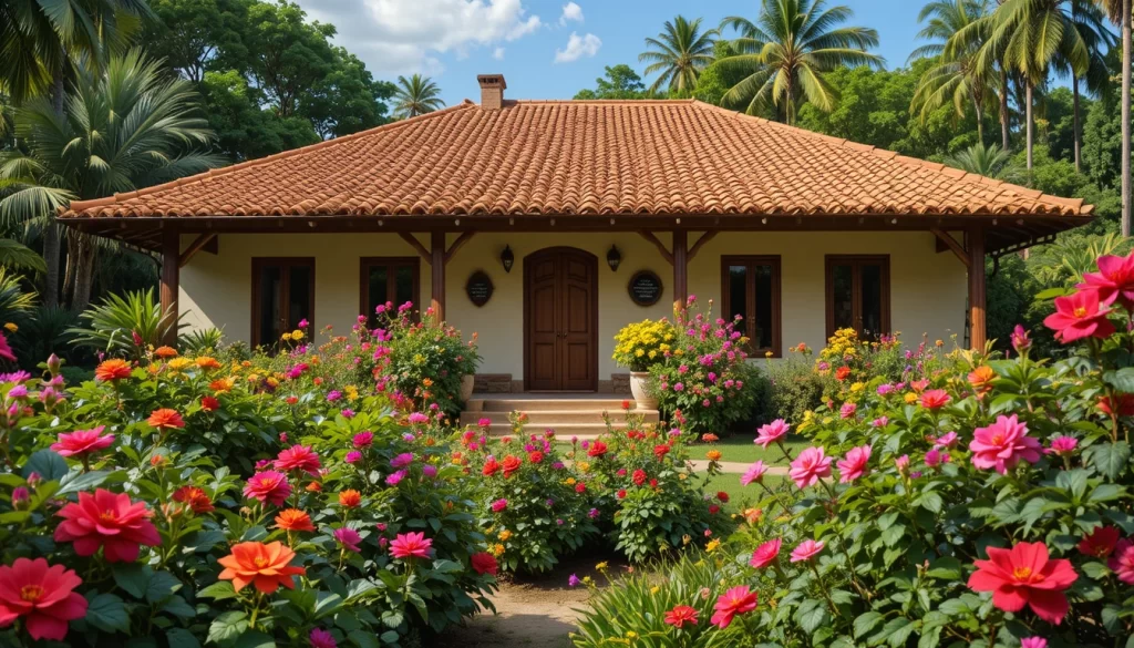12. Casa de campo latinoamericana con techo de tejas naranjas, jardín tropical con rosas rosadas, geranios rojos y dalias amarillas, vegetación abundante.