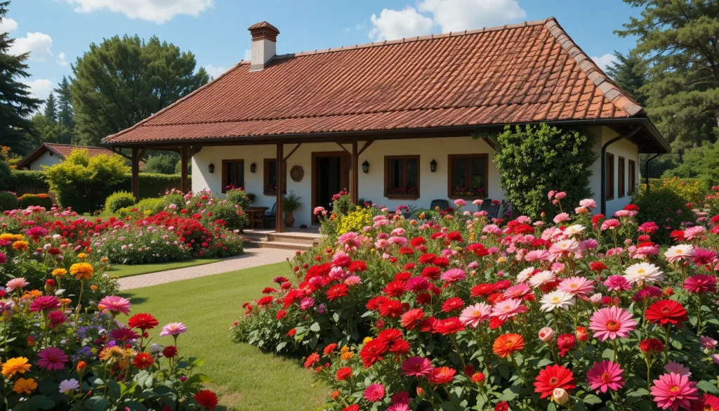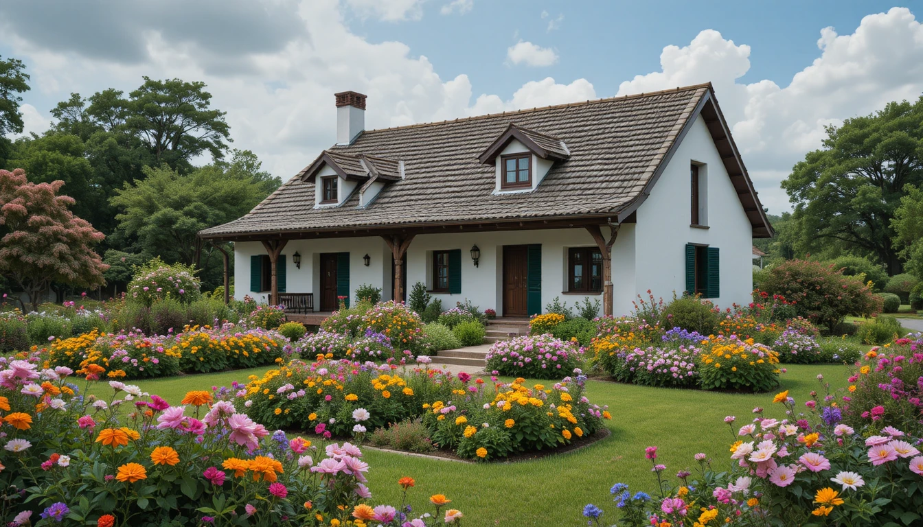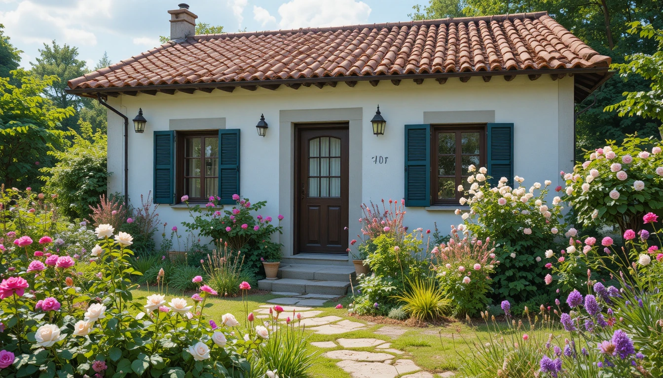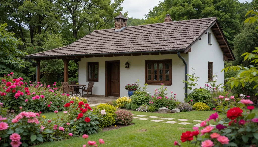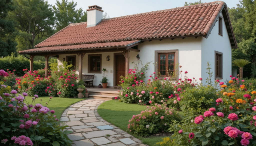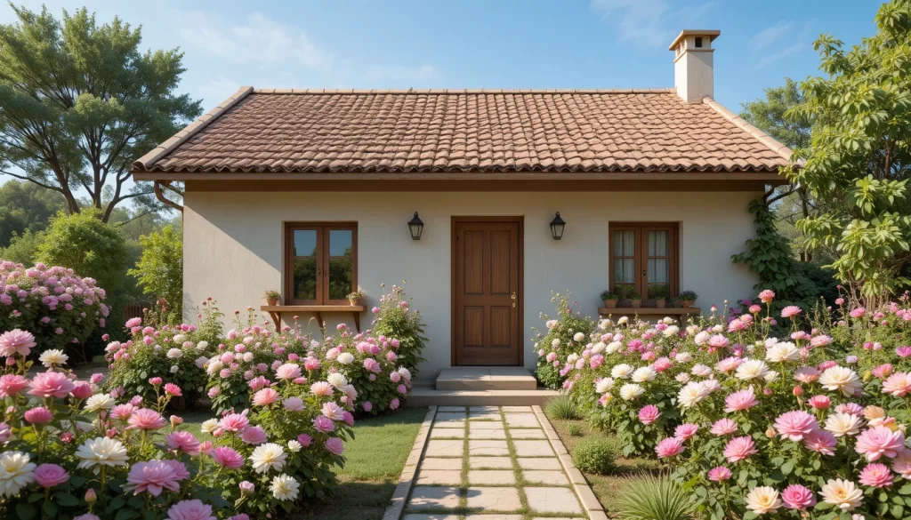 9.-Casa de campo sencilla con techo de tejas marrón oscuro, jardín natural con rosas silvestres, geranios rojos y dalias rosadas, entorno rural y relajante.