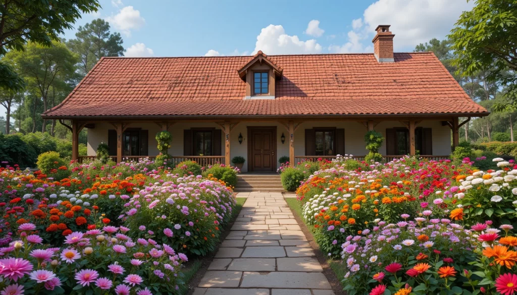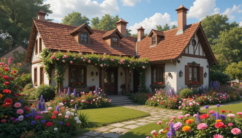 20.-Casa de campo de ensueño con techo de tejas combinadas (rojas y marrones), jardín abundante lleno de rosas, geranios y dalias de muchos colores, senderos naturales, estilo realista y acogedor.