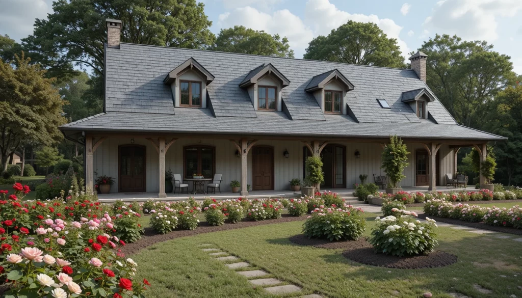 15.-Casa de campo moderna-rústica con techo de tejas gris oscuro, jardín ordenado con rosas rojas, geranios rosados y dalias blancas, estética limpia y elegante.