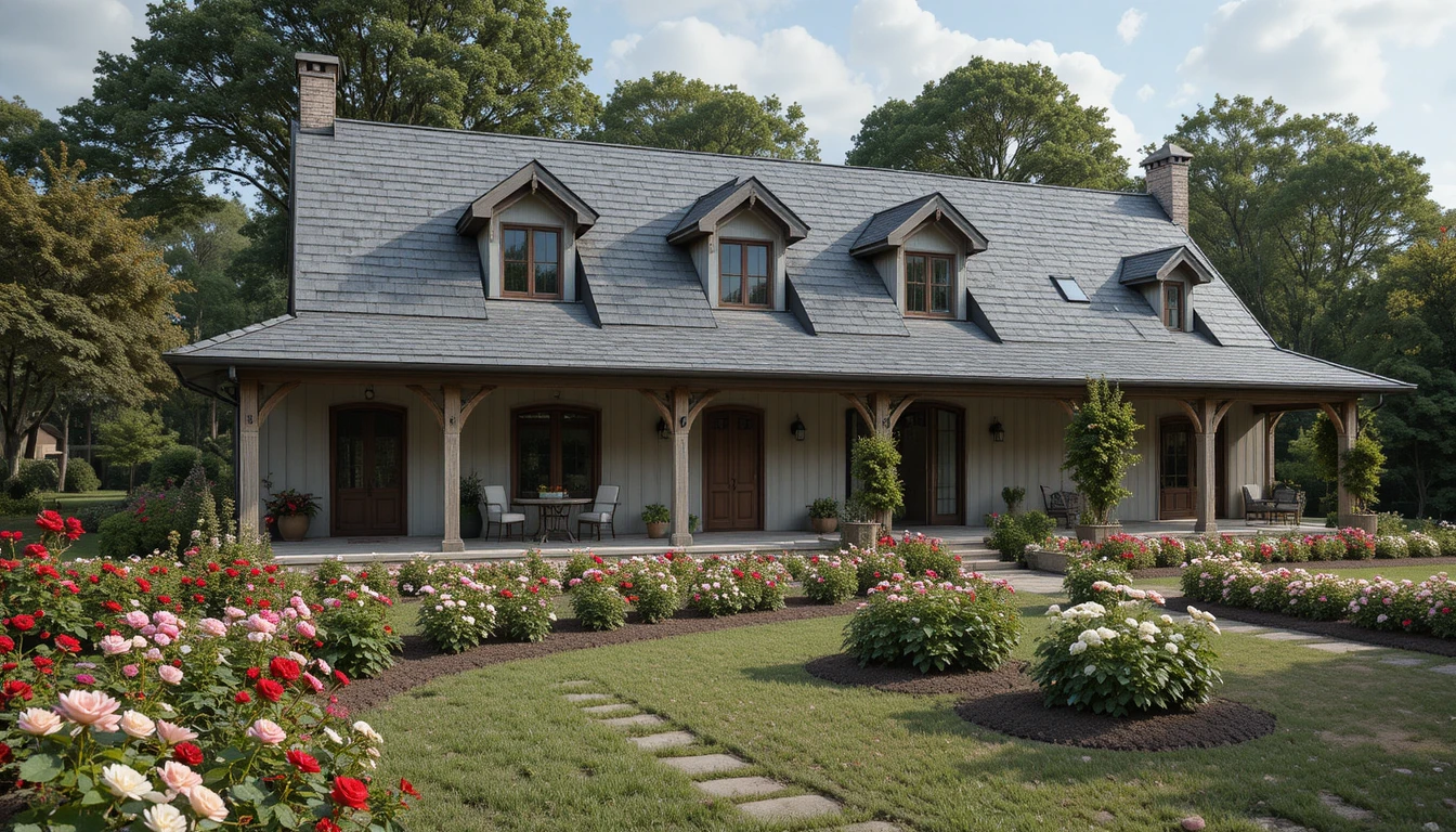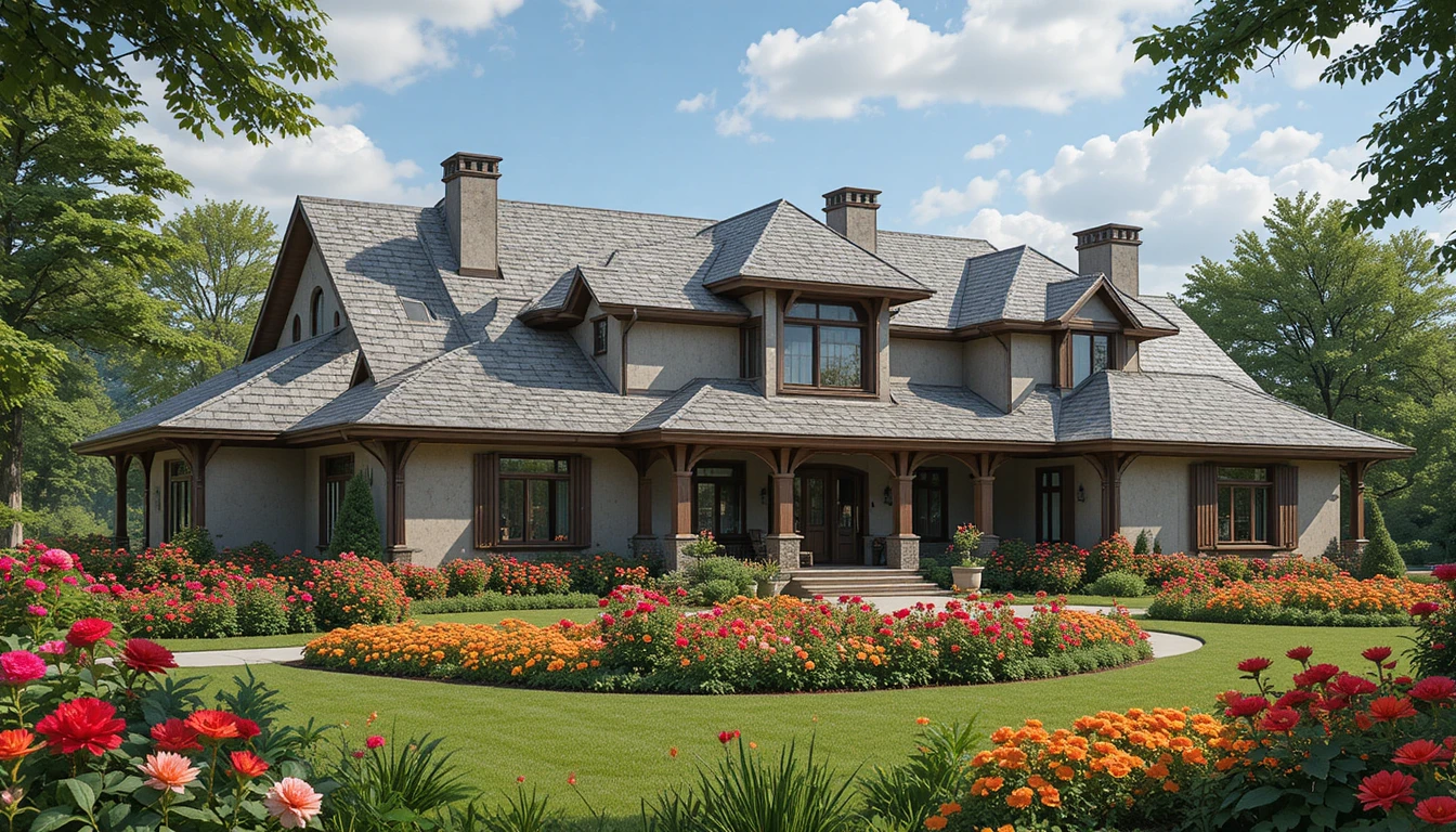 5.-Casa de campo rústica-moderna con techo de tejas grises, grandes ventanales, jardín ornamental con rosas rojas, geranios colgantes y dalias naranjas, estilo realista de alta resolución.
