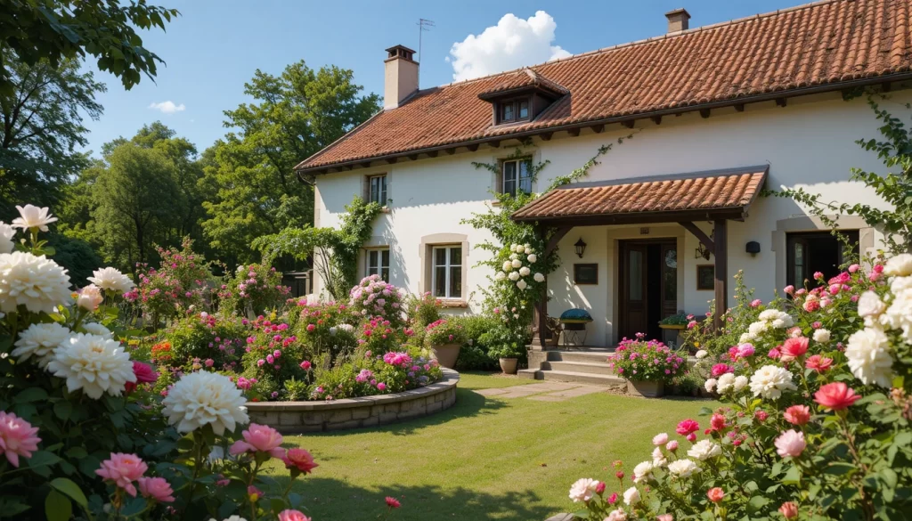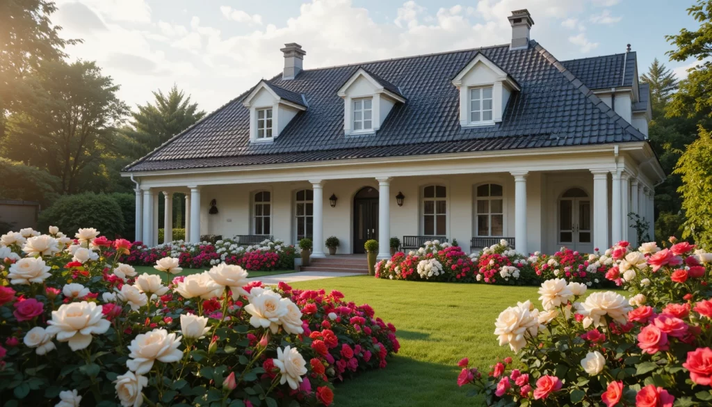 4.-Casa de campo clásica con techo de tejas negras, fachada crema, jardín elegante con rosas blancas, geranios rojos y dalias rosadas, composición armoniosa y luz de mañana.