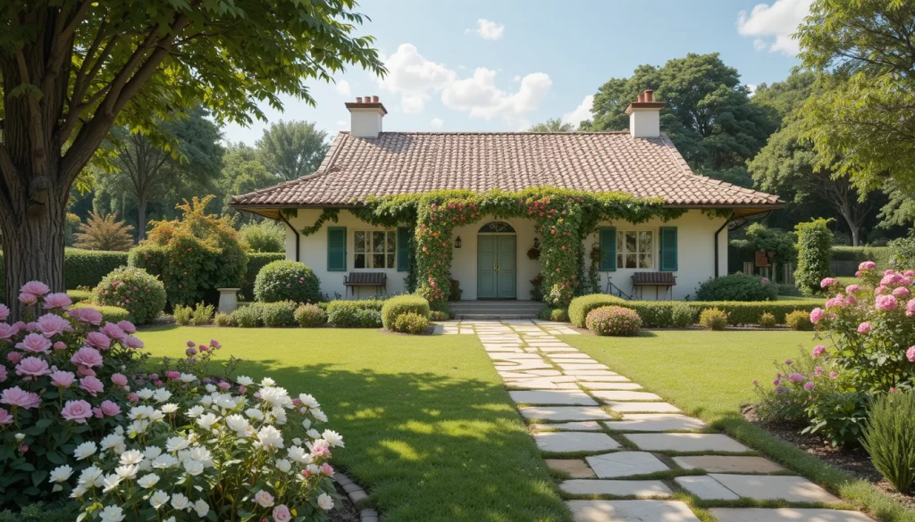 18.-Casa de campo luminosa con techo de tejas crema, jardín amplio con rosas blancas, geranios rosados y dalias lilas, caminos de piedra clara y atmósfera tranquila.
