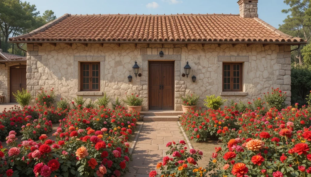 2.- Casa de campo tradicional con techo de tejas color terracota, paredes de piedra clara, jardín frontal lleno de rosas trepadoras, geranios rojos y dalias amarillas, ambiente cálido y campestre.