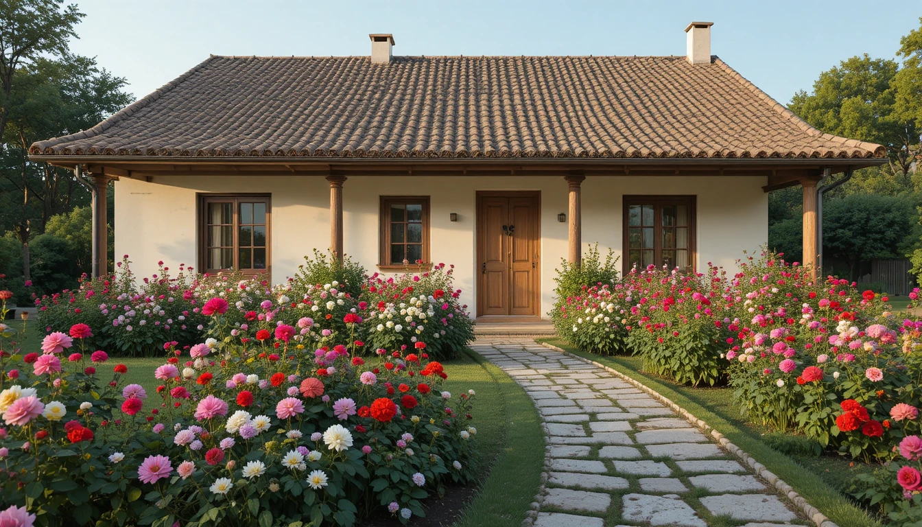 14.-Casa de campo rústica con techo de tejas marrón rojizo, jardín campestre con rosas trepadoras, geranios en macetas y dalias multicolores, luz suave y realismo alto.