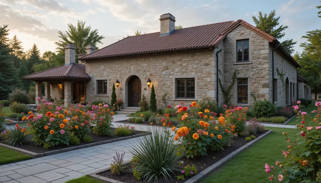 8.-Casa de campo de piedra con techo de tejas rojas envejecidas, jardín clásico con rosas rojas intensas, geranios en jardineras y dalias amarillas, luz de atardecer.
